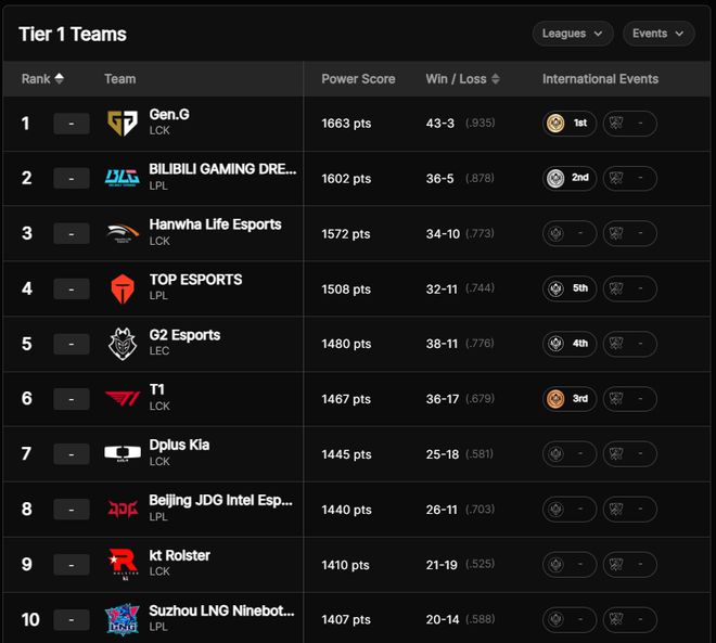 竞技宝:LOL推出全球战队战力排名:GEN第一BLG第二TES第四