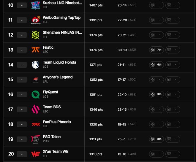 第10名与第20名主要是LPL赛区的战队占据前列,欧美赛区的队伍有一些登场。