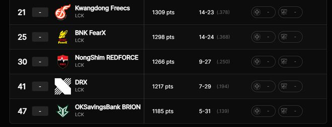 LCK赛区的BRO战队排在第47位。
